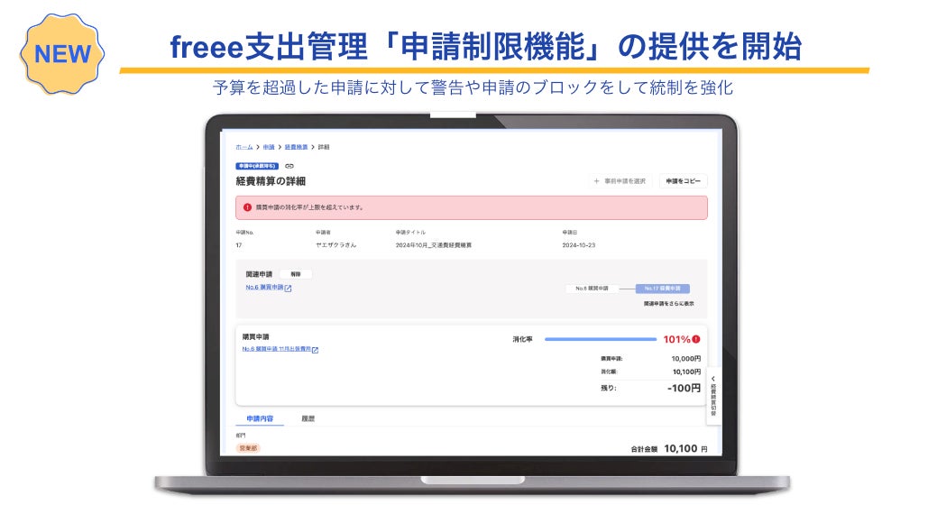 フリー株式会社(本社:東京都品川区、CEO:佐々木大輔)はfreee支出管理において、事前申請(購買申請)の予算を超過した申請に対して、エラー表示または申請をブロックする「申請制限機能」の提供を開始しました。