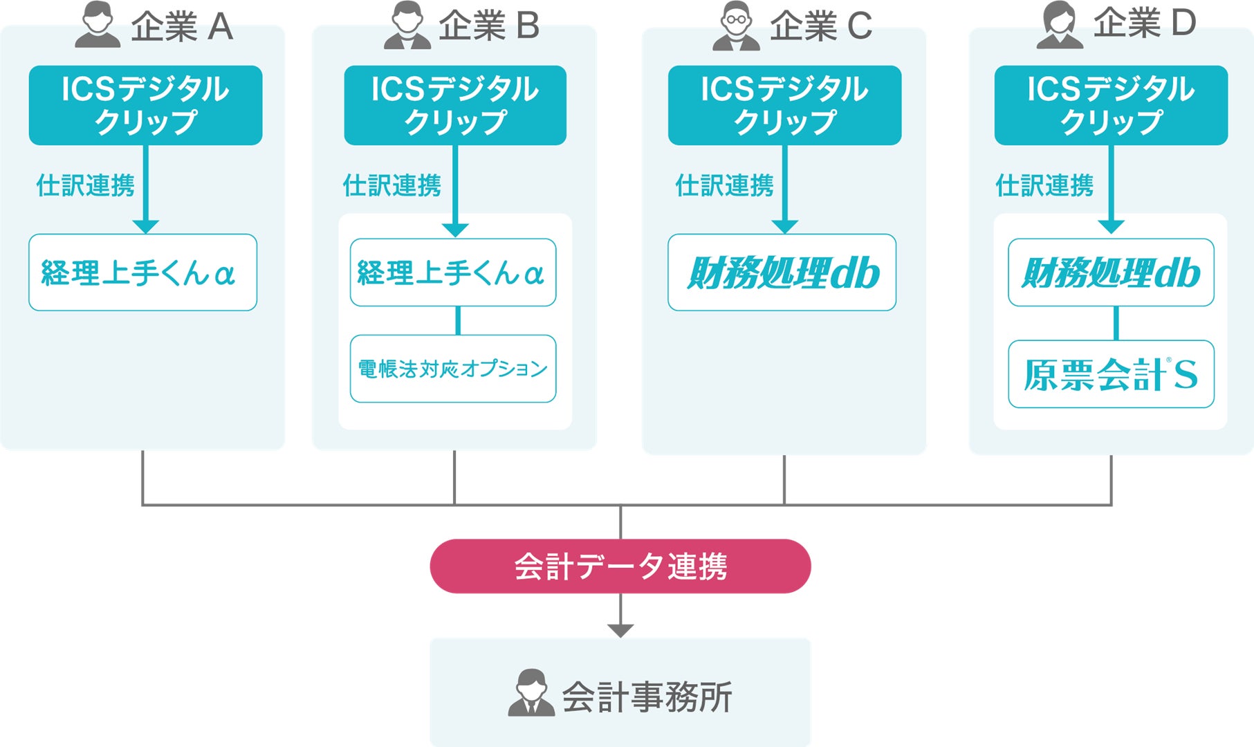 「ICSデジタルクリップ」は、会計事務所の顧問先企業が利用する日本ICSの財務会計システム「財務処理db」及び、自計化支援システム「経理上手くんα」に追加導入する製品です。仕訳データの自動連携が実現することで、業務処理スピードと正確性が格段に向上するだけではなく、経理部門担当者の大幅な負担軽減とデジタル化の推進に繋がります。