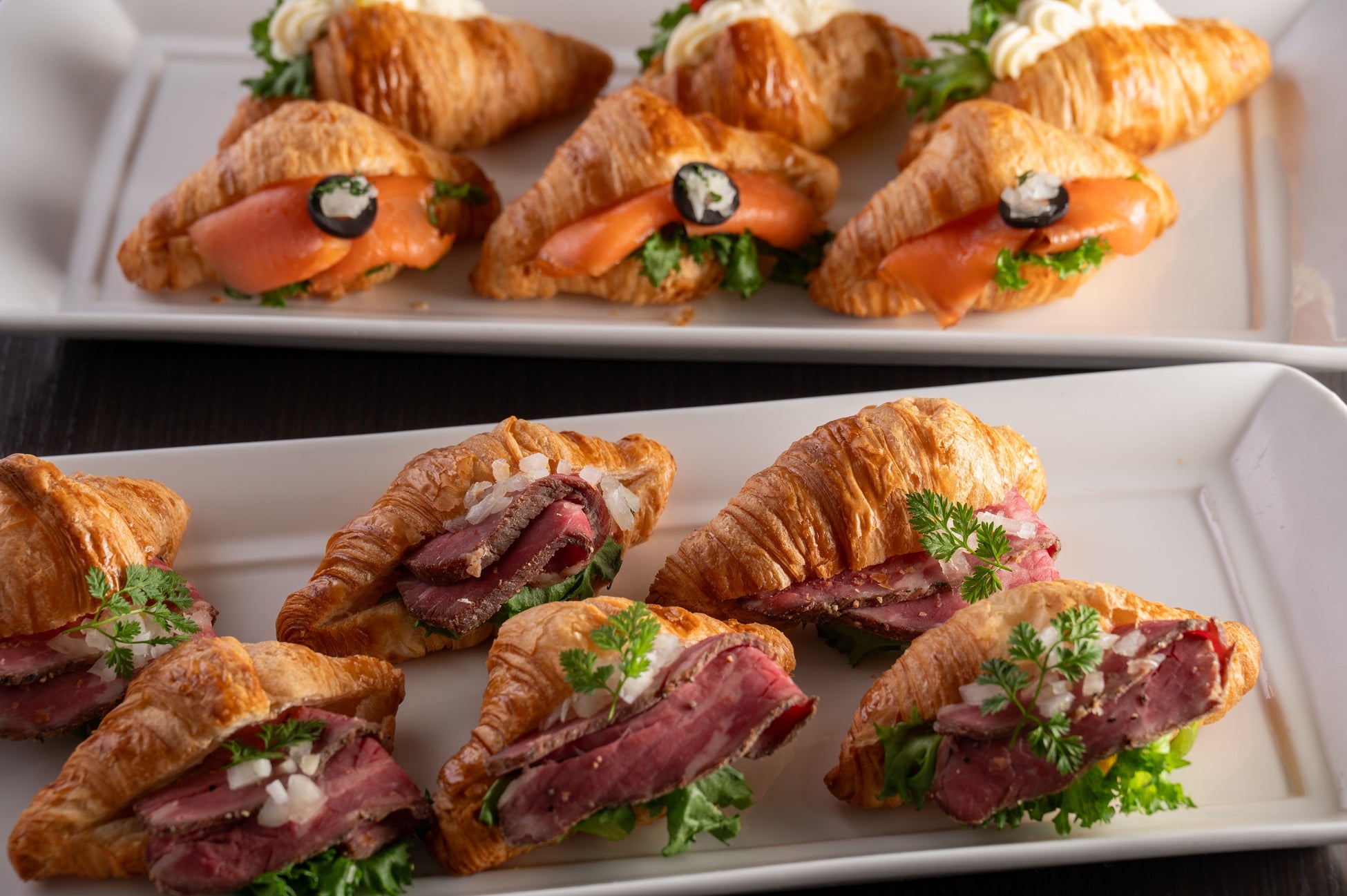 また、焼き立てのクロワッサンにローストビーフやスモークサーモン、クリームチーズをサンドしたミニサンドイッチもご用意いたします。