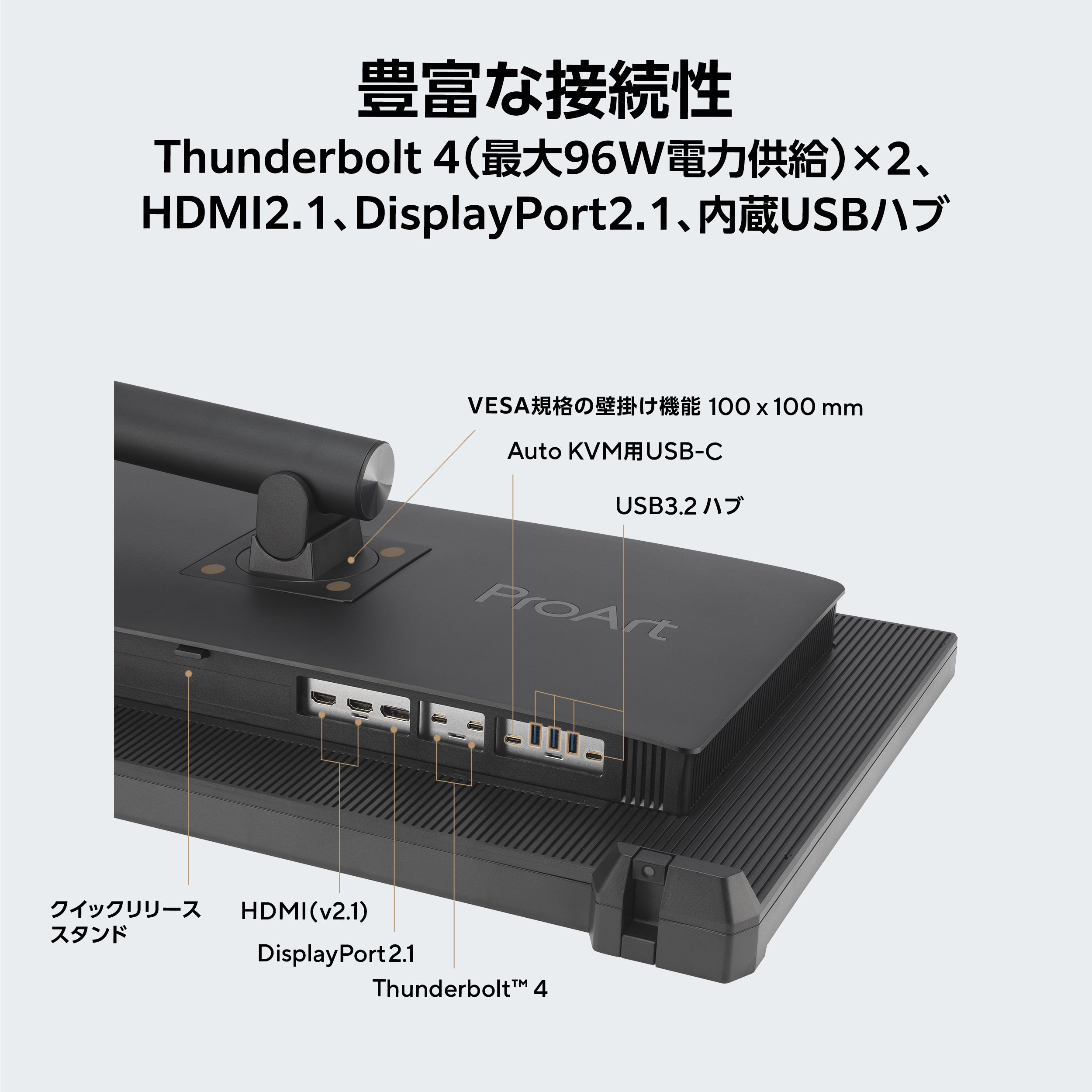 接続端子:Thunderbolt 4 ×2(最大96W給電/デイジーチェーン対応)、DisplayPort 2.1、HDMI 2.1 ×2