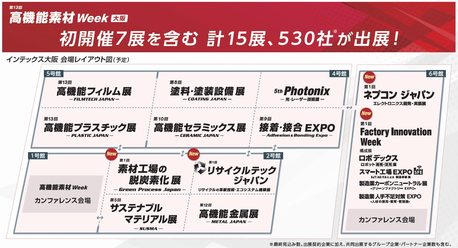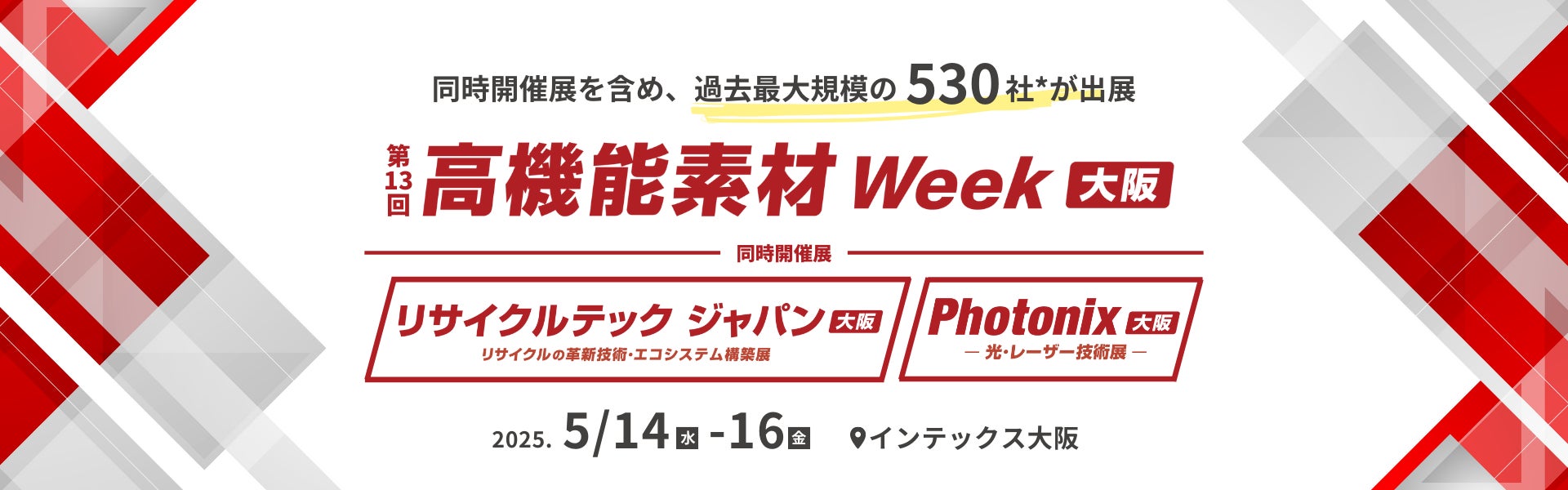 2025年5月14日(水)から3日間、インテックス大阪にて「高機能素材Week 大阪」を開催します。同時開催展を含め、過去最大規模の530社*が出展。素材産業を中心とした業界発展を目的としています。