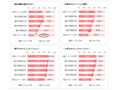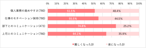 リモートワーク経験のある20~50代の正社員に個人業務の進めやすさについて聞くと、「厳しくなった(51.5%)」、「楽になった(48.4%)」で約半々となった。仕事のモチベーション保持は、「難しくなった」が55.5%、「楽になった」が44.5%と「難しくなった」が上回った。また、部下とのコミュニケーションが「難しくなった」は74.8%、上司とのコミュニケーションが「難しくなった」は64.1%だった。特に対部下へのコミュニケーションが難しくなったと感じる人が多いようだ。【図7】