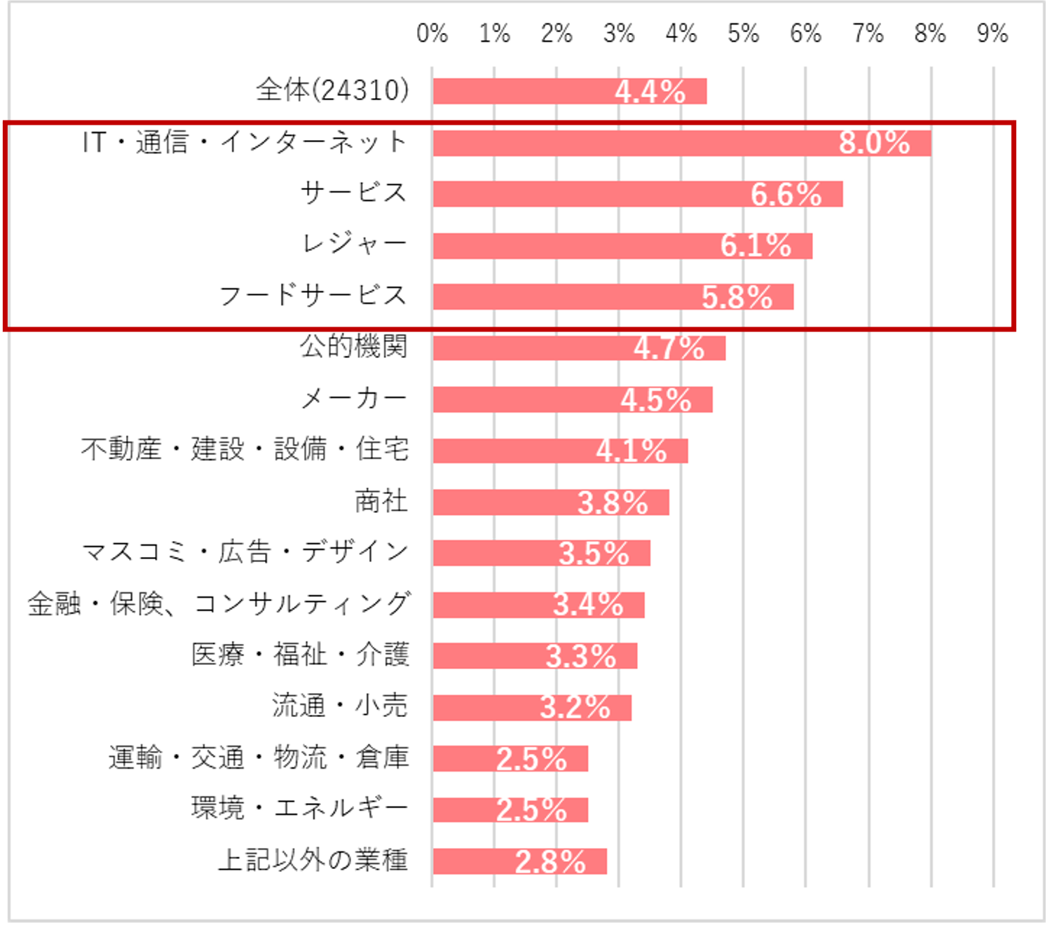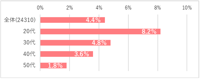 20~50代の正社員のうち、6月に転職活動をした人は4.4%、若年層ほど高く、20代では8.2%となった。業種別では、[IT・通信・インターネット][サービス][レジャー][フードサービス]従事者の転職活動が活発に行われていたようだ。【図4、5】