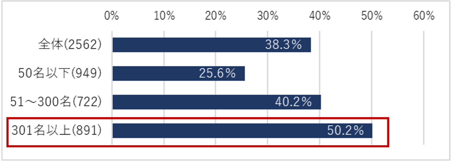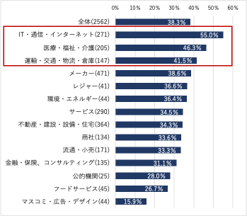 6月の中途採用活動について、従業員規模別で見ると301名以上の企業で50.2%が実施したと回答した。業種別では[IT・通信・インターネット]が最も高く55.0%、次いで[医療・福祉・介護](46.3%)、[運輸・交通・物流・倉庫](41.5%)で中途採用が活発に行われていた。【図1、2】