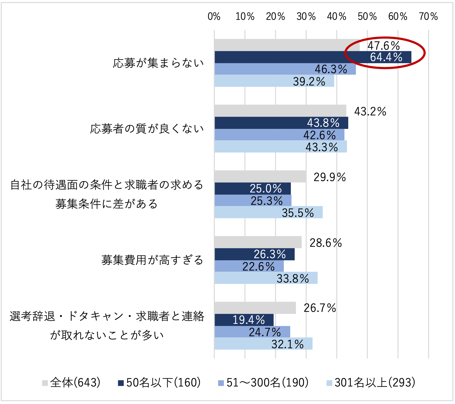 中途社員を採用する上での悩みは「応募が集まらない」が47.6%と最も高くなった。従業員規模別では50名以下が64.4%となり、採用が活発化し求職者の獲得競争が激しくなる中で、特に中小企業が応募獲得に苦戦しているようだ。【図3】