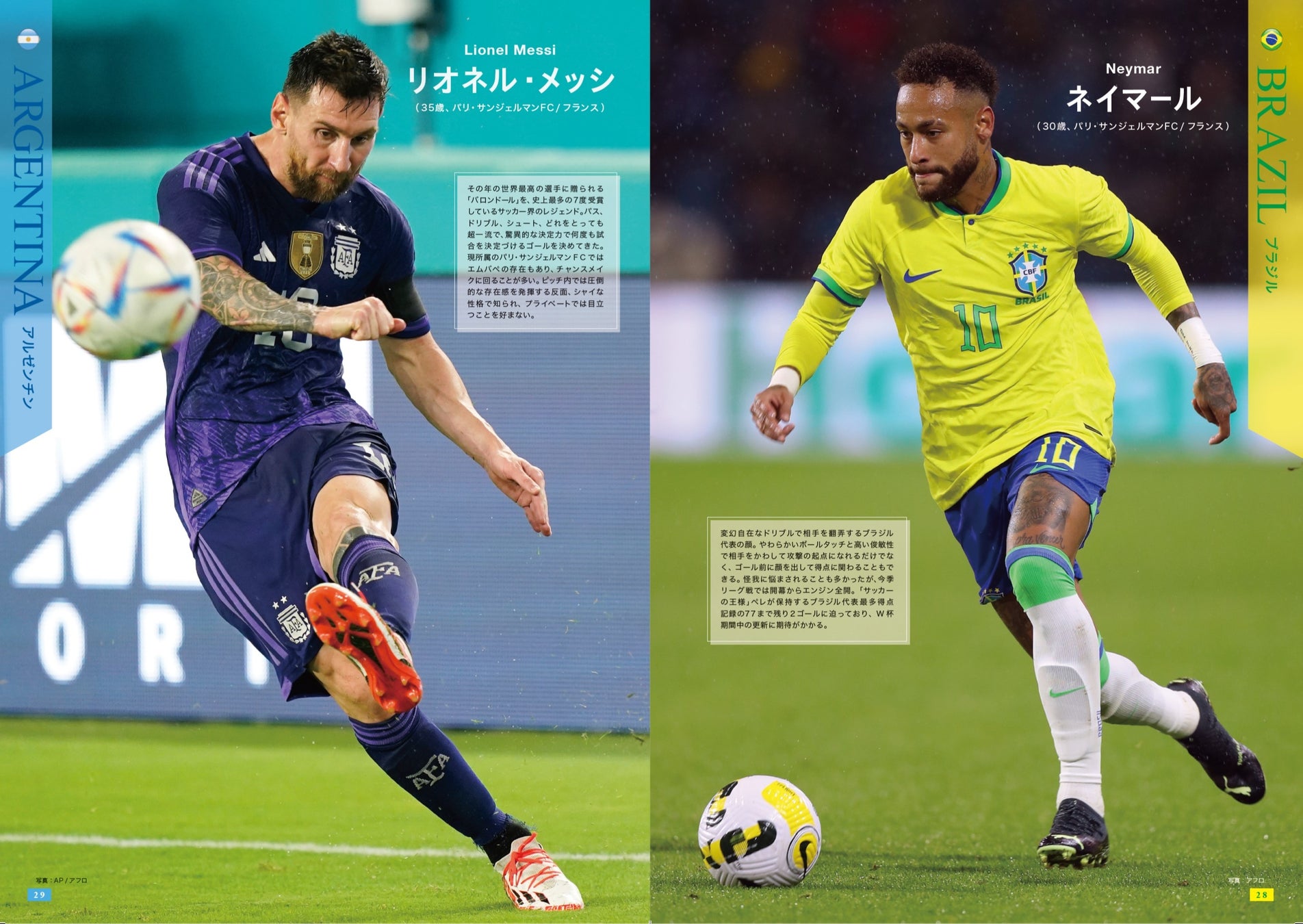 さらに冊子には注目選手たちのグラビアを掲載。日本代表からは中心選手である南野拓実や伊東純也、冨安健洋、遠藤航、フレッシュな久保建英、三笘薫、田中碧、ベテランの吉田麻也、長友佑都が登場します。海外からもリオネル・メッシ、クリスティアーノ・ロナウド、ネイマール、キリアン・エムバペといったスターのほか、ドイツ、スペイン、コスタリカなど各国の名選手、全30名をピックアップ。