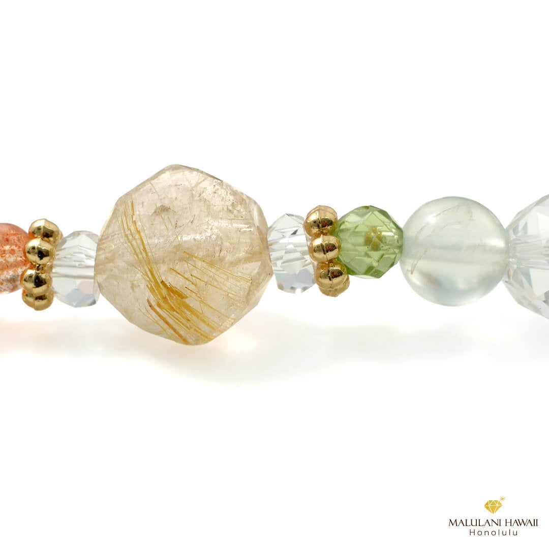 健康や希望をもたらすペリドット、豊かさと活力をもたらすルチルクオーツを合わせたブレスレットは、成功、厄除けのお守りとしても最適です。
