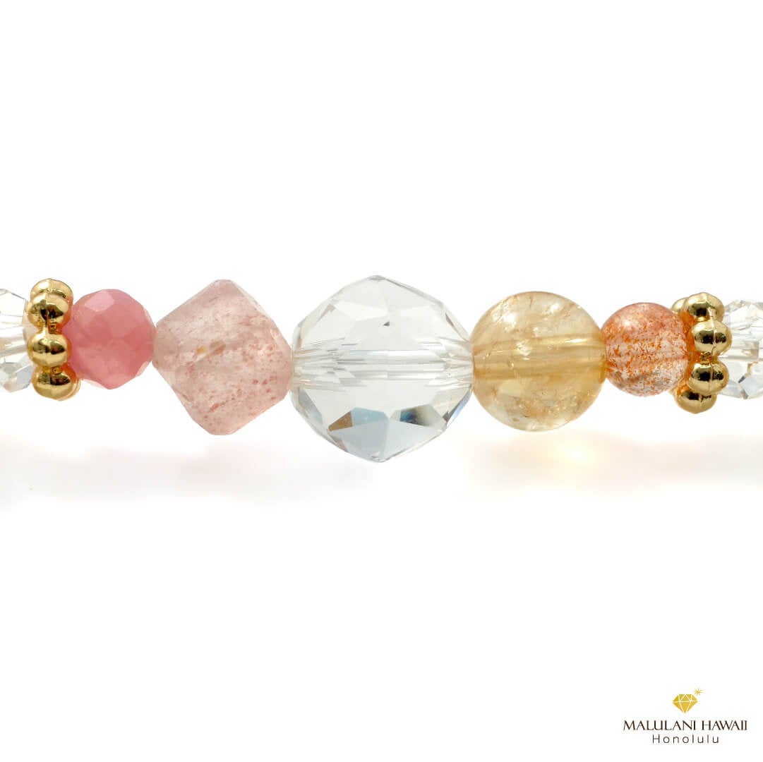 太陽を象徴するサンストーンとシトリンが金運や繁栄を、ストロベリークォーツとインカローズが愛情運と魅力UPをもたらし、全体的な幸福と開運を願う仕立てとなりました。