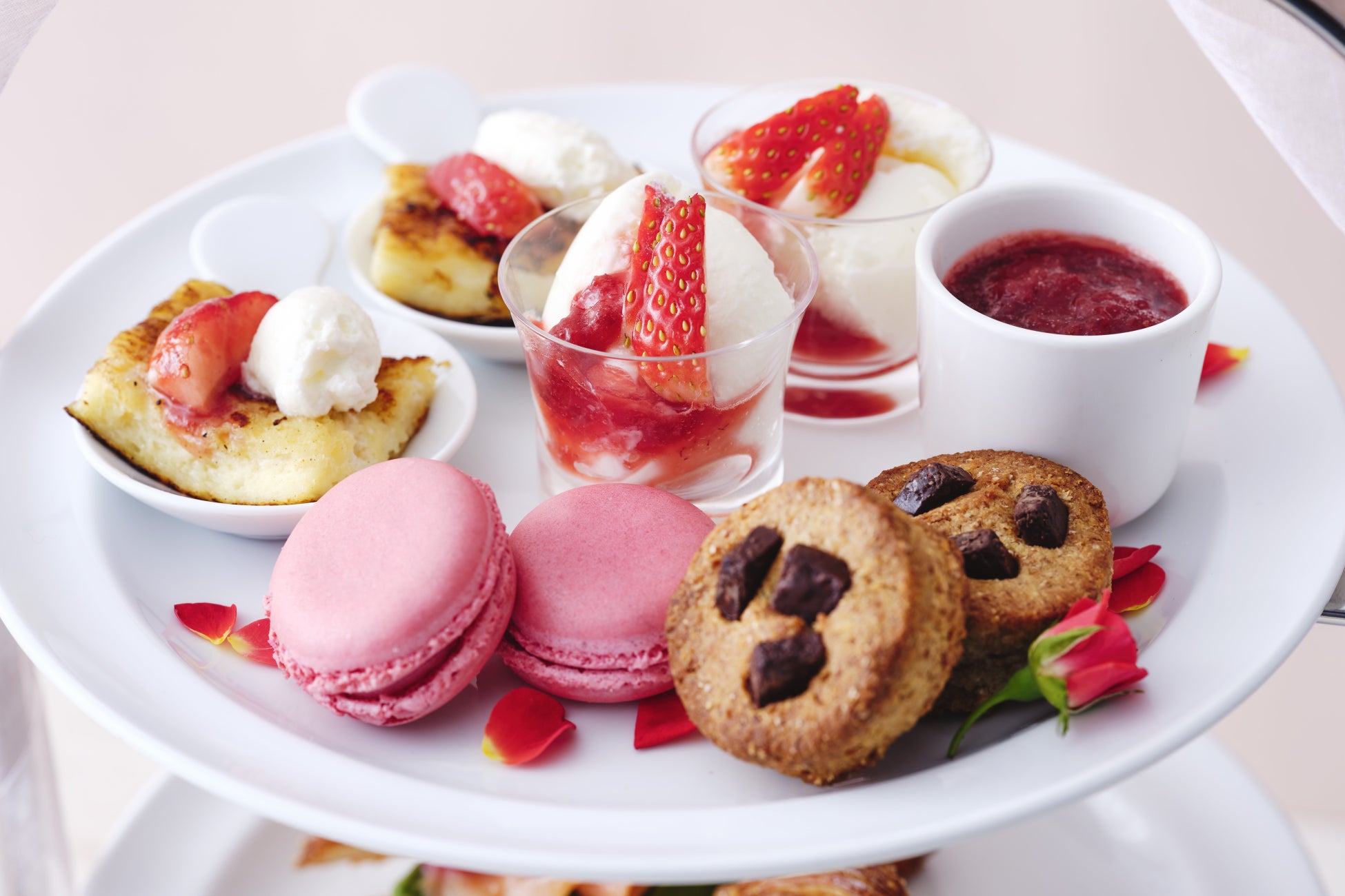 ストロベリーショコラスコーン、マカロン、ストロベリーのレアチーズケーキ、苺ソースのプチフレンチトースト
