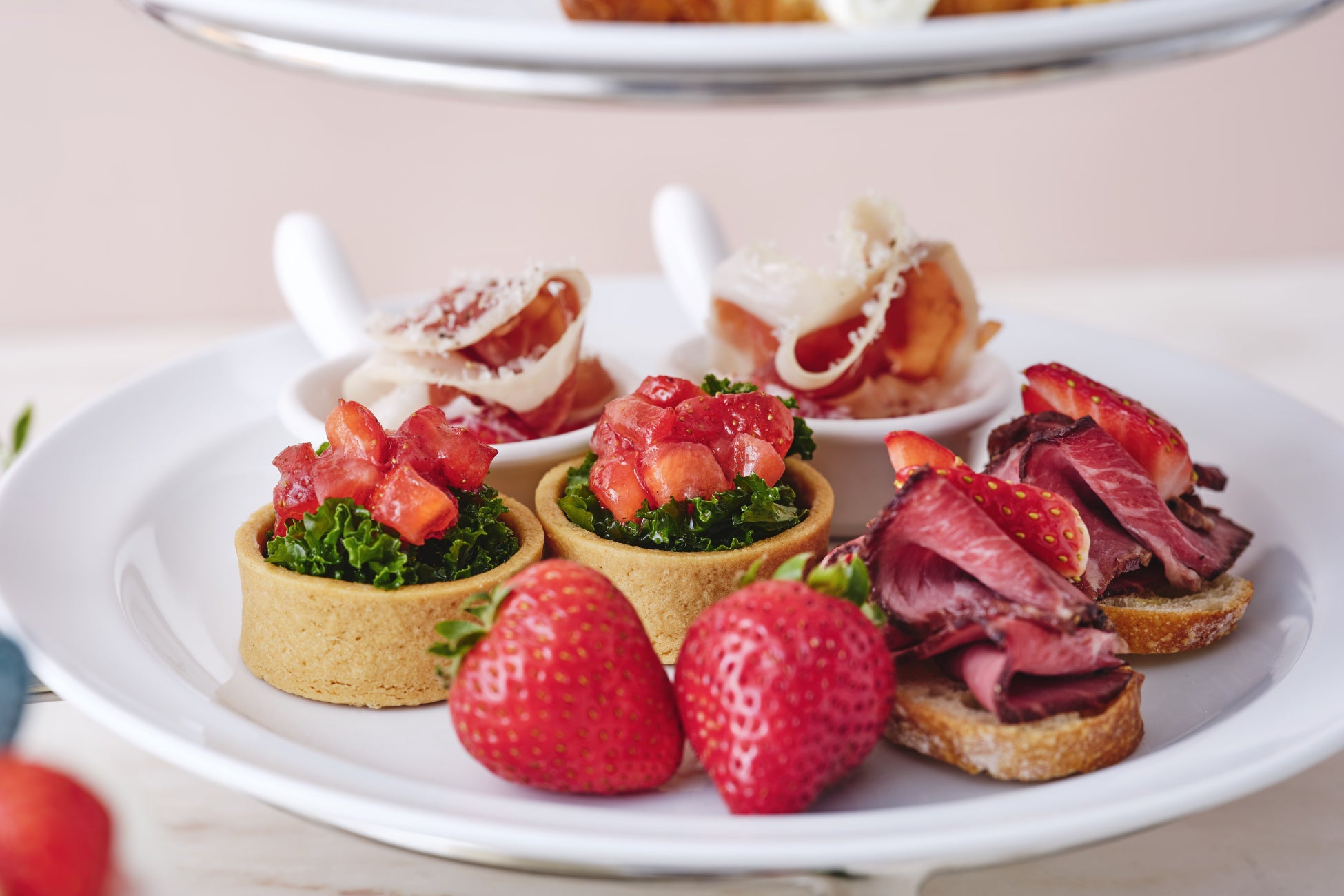 また下段のセイボリーには、マスカルポーネ、スパイスと蜂蜜を合わせ、スペイン産生ハムのハモンセラーノを添えた苺のココット、苺とケールのタルトサラダ、苺とバルサミコソースのローストビーフが並び、お酒ともマッチするラインナップにいたしました。