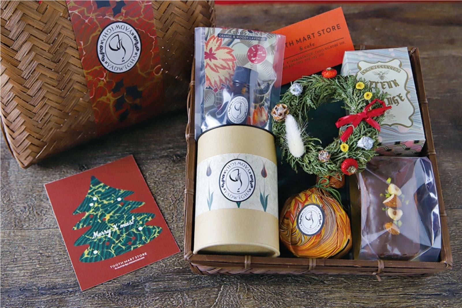 南阿蘇のオーガニック精油を使用したオリジナルブレンドアロマを使った、アロマキャンドルやバスボム、アロマオイルと合わせて、TOOTH TOOTHの焼菓子や紅茶、X'masミニリースorミニツリーがセットになった華やかなX'masギフト仕様で、TOOTH TOOTHの”ハレノニチジョウ”を贈りましょう。