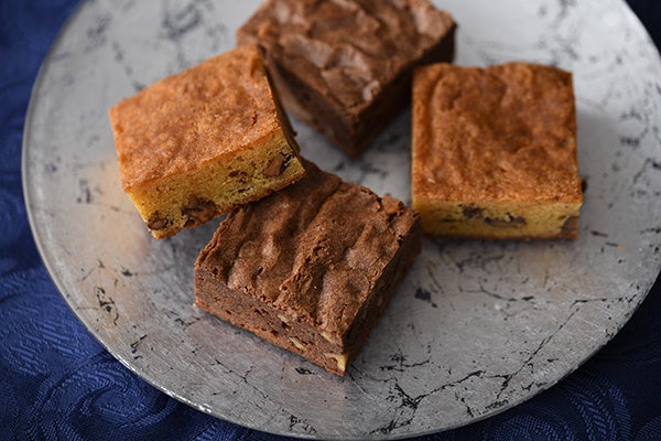 ヴァローナ社のチョコレートを使用した、クルミとカカオの深い味わいが特徴のグアナラを使ったブラウニーと、ピーカンナッツとキャラメル風味のドゥルセを使用したブラウニーの2種類をご用意しました。