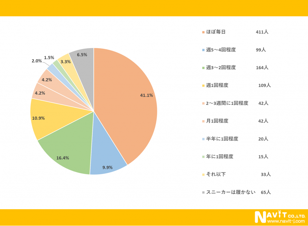 「どのくらいの頻度でスニーカーを履きますか?」という質問については、「ほぼ毎日」が41.1%、「週3~2回程度」が16.4%、「週1回」が10.9%という順になり、週の半分以上スニーカーを履いている人が大半だということが分かりました。