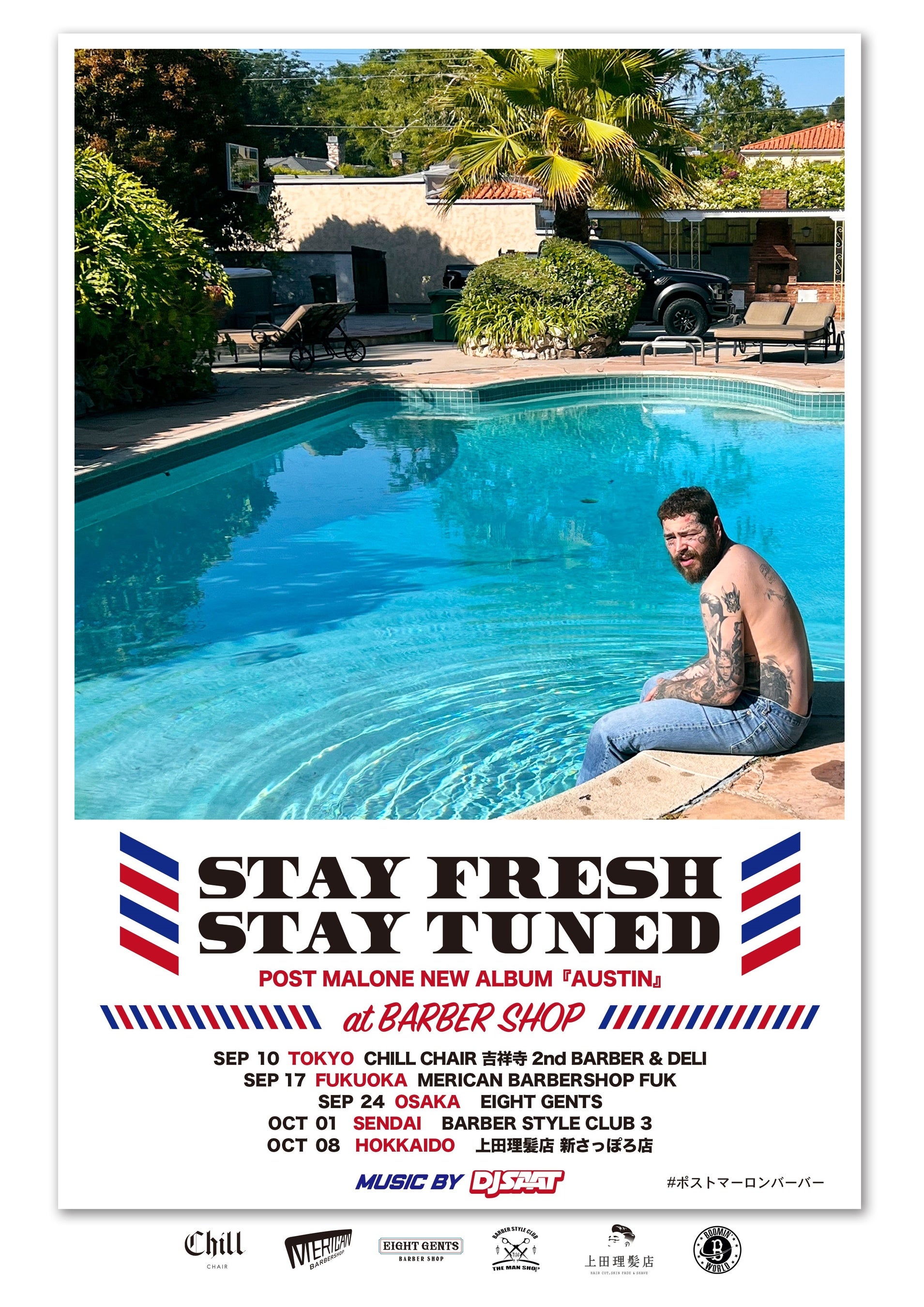 日本盤の発売を記念して、BARBER SHOPとのキャンペーン「STAY FRESH STAY TUNED Post Malone New Album “Austin”」がスタート。全国のBARBER SHOPが、店内BGMをはじめ、限定ステッカー配布、オリジナルカットクロスでのカットなど、期間限定でポスト・マローン一色となっています。キャンペーン期間中には全国5都市でPOP UP EVENTも開催される予定です。
