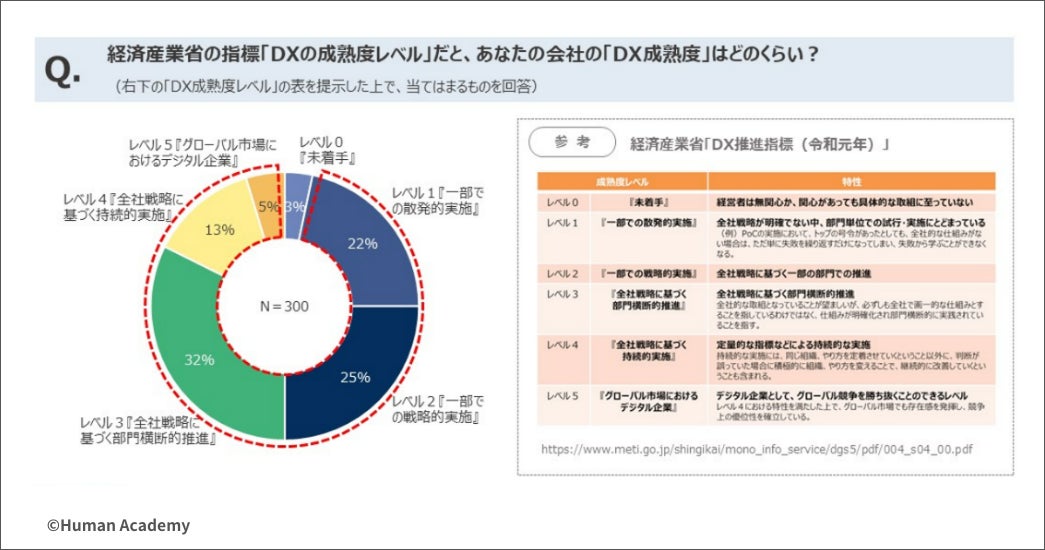 教育事業を展開するヒューマンアカデミー株式会社(本社:東京都新宿区、代表取締役:今堀健治、以下「当社」)は、「2025年の崖」やIT人材不足がクローズアップされるなか、企業のDX推進の状況や取り組みについて、人事・研修担当者300人を対象に調査をしました。