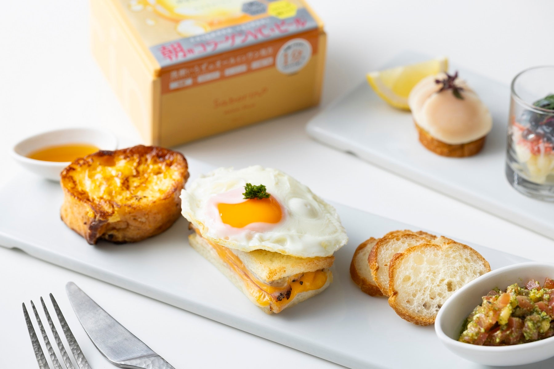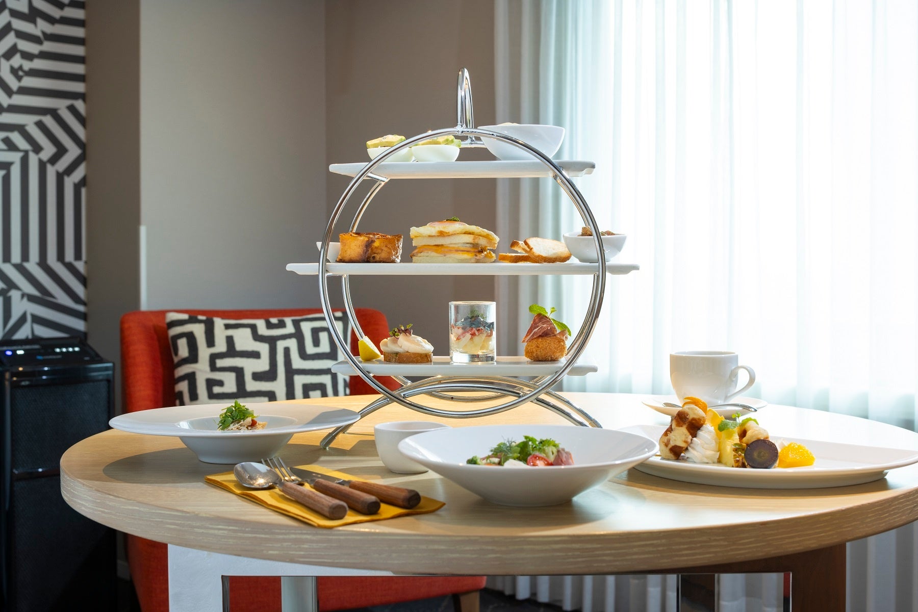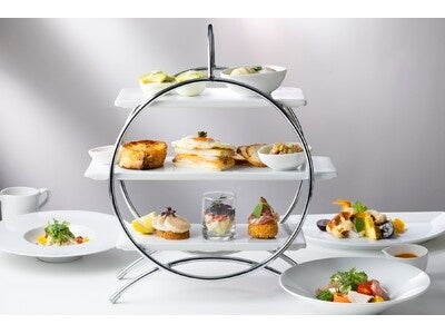 プランオリジナル朝食はアフタヌーンティースタイルでご用意いたします。アクセントカラーには、メガショットをイメージして、オレンジ色や青色を入れております。サラダや玉子料理をはじめ、フレンチトースト、ワッフルなど華やかな朝食を香りとともに楽しみながら、ゆっくりと身体を目覚めさせるひとときをお過ごしください。