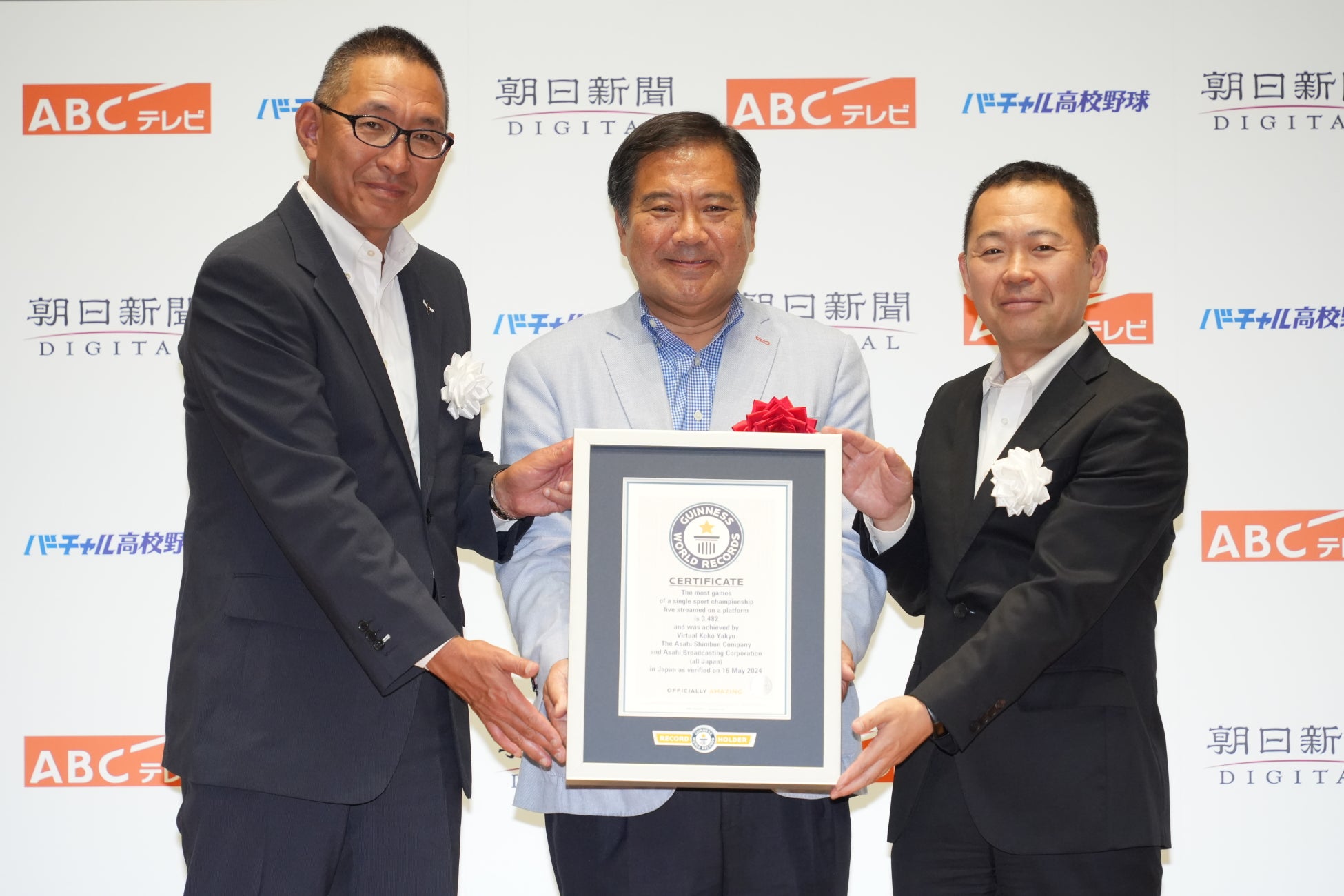朝日新聞社(代表取締役社長:中村史郎)と朝日放送テレビ株式会社(代表取締役社長:今村俊昭)は、「バーチャル高校野球」上で配信した昨夏の第105回全国高校野球選手権記念大会の配信試合数が3,482試合で、最多の配信試合数(単一スポーツチャンピオンシップをプラットフォームでライブストリームした試合数)としてギネス世界記録™に認定されました。地方大会から全国大会までの全試合です。これを祝し、2024年6月10日にギネス世界記録™公式認定員より、公式認定証の授与が行われました。