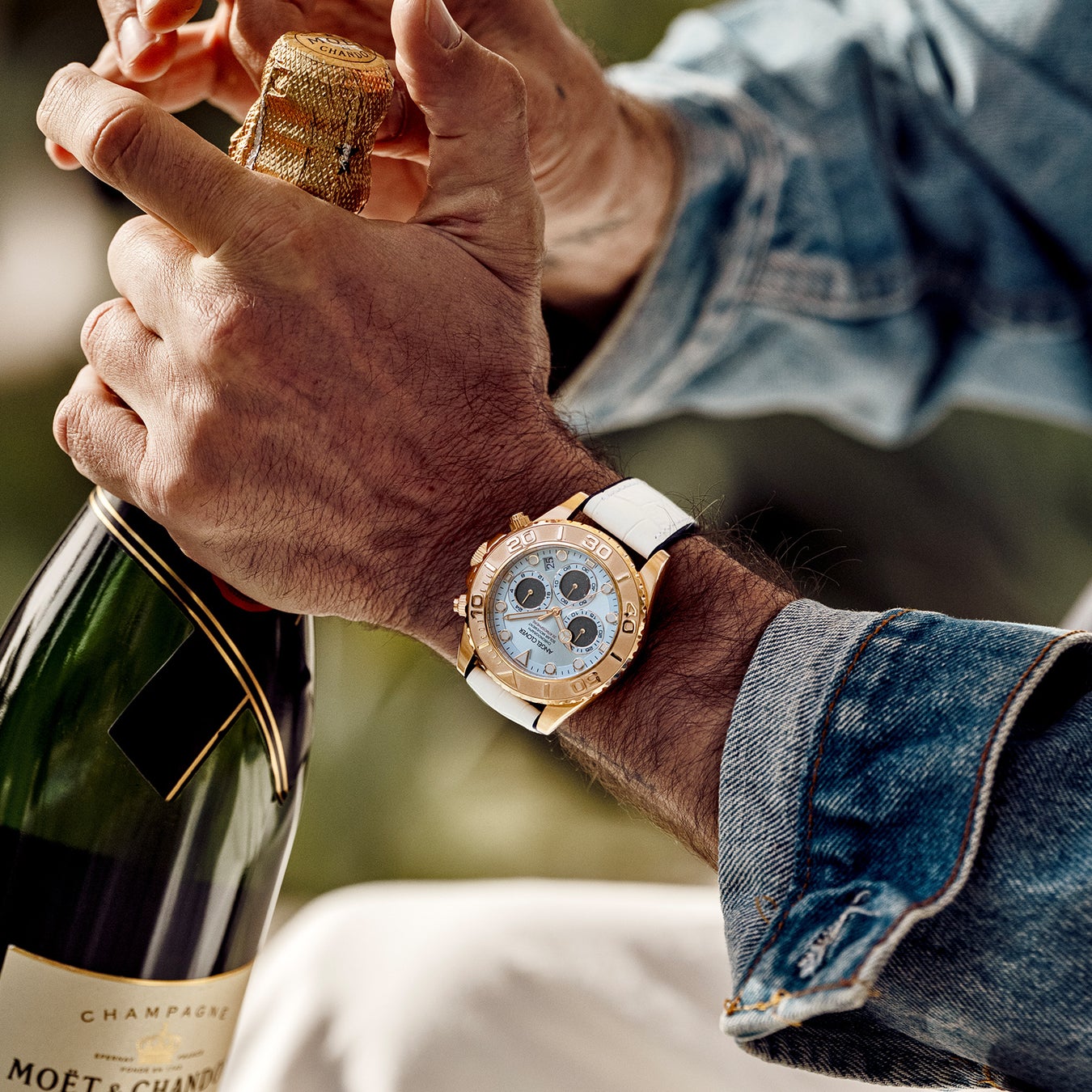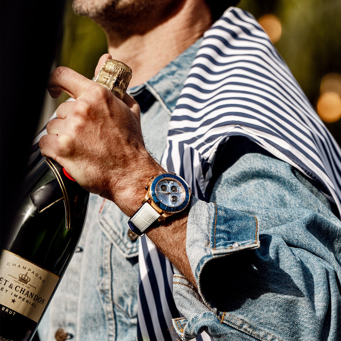 ケース・ベゼル・リューズをゴールドで纏った、公式オンラインショップ限定カラー。45mm径のビックフェイスにラグジュアリーな雰囲気のゴールドベゼルはインパクト絶大。ブルーベゼルもゴールドベゼルも文字盤の淡いブルーと相まって、ときに力強く、ときに爽快な夏のスタイルアップを叶えてくれます。