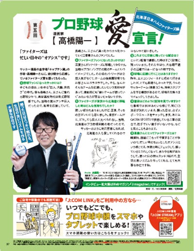 連載「プロ野球“愛”宣言!」は、J:COMご加入者さま向け番組ガイド誌「ジェイコム マガジン」ならびに“エンタメをもっと楽しむWebマガジン”「J:magazine!」(読み:ジェイマガジン)で毎月日本全国のプロ野球ファンにお届けしています。著名人の球団ファンになったきっかけや、ご自身の“リアル”な「プロ野球の応援&観戦スタイル」を語ります。第5回は幼少期から日本ハムファイターズのファンで、ファイターズが勝った日はスッキリ眠れる漫画家・高橋陽一さんの熱い“ファイターズ愛”をお楽しみいただけます。