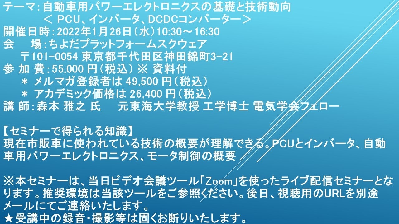 先端技術情報や市場情報を提供している(株)シーエムシー・リサーチ(千代田区神田錦町: https://cmcre.com/ )では、 各種材料・化学品などの市場動向・技術動向のセミナーや書籍発行を行っておりますが、 このたび「自動車用パワーエレクトロニクスの基礎と技術動向 < PCU、インバータ、DCDCコンバーター>」と題するセミナーを、 講師に森本 雅之 氏 元東海大学教授 工学博士 電気学会フェロー)をお迎えし、2022年1月26日(水)10:30より、 ちよだプラットフォームスクエア(東京都千代田区)にて開催いたします。 受講料は、 一般:55,000 円(税込)、 弊社メルマガ会員:49,500 円(税込)、 アカデミック価格は26,400 円(税込)となっております(資料・昼食付)。