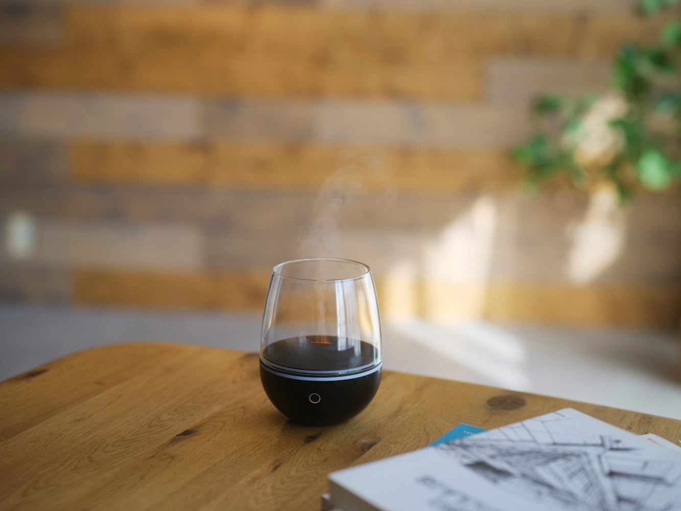 グラス内でミストが渦を描きながら噴き出すユニークな演出が特徴。アロマオイルが使用可能。
