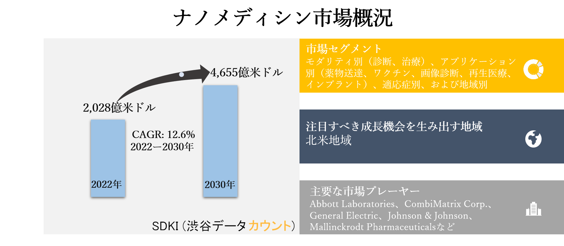 SDKI Inc.は、ナノメディシン市場の新レポートを2022年01月10日に発刊しました。この調査には、ナノメディシン市場の成長に必要な統計的および分析的アプローチが含まれています。レポートで提供される主要な産業の洞察は、市場の既存のシナリオに関する読者に市場の概要についてのより良いアイデアを提供します。さらに、レポートには、市場の成長に関連する現在および将来の市場動向に関する詳細な議論が含まれています。