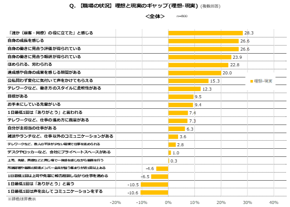 今の職場は働き甲斐があるといえるか聞いたところ、「働きがいがある」と回答したのは65.0%だった(「とても働きがいがある」+「働きがいがある」の合計)。どんな時に働きがいを感じるかは、「自身の成長を感じる(55.6%)」が最も高く、次いで「誰かの役に立てたと感じる(49.8%)」など、充足感を得ることに働きがいを感じている傾向がある。しかし、現在の職場状況を聞くと、「誰かの役に立てたと感じる」が21.5%で理想と現実のギャップが28.3pt、「自身の成長を感じる」が29.0%で理想と現実のギャップが26.6pt生じており、働きがいの理想と現実にへだたりがあることが分かった。働きがいを感じられていない新入社員は勤続意向が短い傾向もあり、新入社員の定着には「働きがい」を持てる環境づくりが重要となる。【図3、4、5、6】