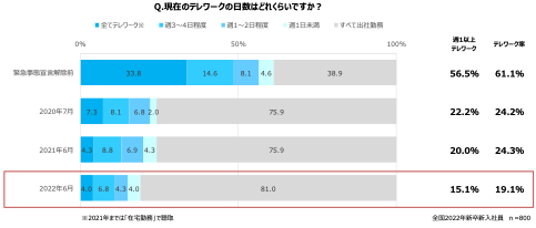 - テレワークをしている人は19.1%で前年より減少。現在もテレワークをしている新入社員で「テレワークが廃止されても働き続ける」は半数に留まる【図8、9】
