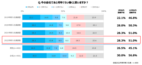 新入社員の勤続意向年数は例年どおり、3年以内が約3割、10年以内が約半数となった。