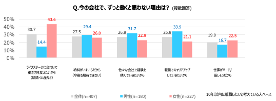 今の会社で働き続けない理由は男女で明確な差があらわれ、男性の上位3つは「転職でキャリアアップしていきたいから(33.9%)」「色々な会社で経験を積んでいきたいから(31.7%)」「給料がいまいちだから(29.4%)」と自身のステップアップに関係する理由が高いのに対し、女性の上位3つは「ライフステージに合わせて働き方を変えたいから(43.6%)」「給料がいまいちだから(26.0%)」「色々な会社で経験を積んでいきたいから(22.9%)」。女性は働き続けたいという意向だが、“今の職場で”仕事と結婚・子育てのベストバランスを実現させるのは難しいと感じているようだ。【図1、2】