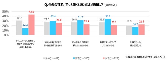 - 新入社員の約半数が10年以内に退職予定。今の会社で働き続けない理由は、男性が「キャリアアップ」、女性は「ライフステージに合わせて働き方を変えたい」が多い結果に【図1、2】