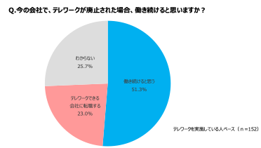 テレワークをしている新入社員は19.1%で、前年(24.3%)からやや減少しており、完全出社が増えている。また、現在テレワークをしている新入社員で「テレワークが廃止されても働き続ける」と回答した人は51.3%で、約2割が「テレワークできる会社に転職する」となった。テレワークの廃止をきっかけに、転職する人が一定数出る可能性が考えられる。【図8、9】