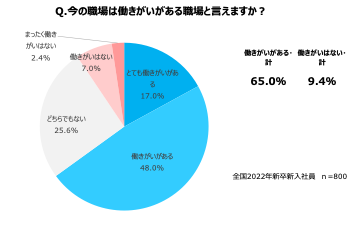 - 現在の職場で働きがいを感じている人は65.0%。働きがいを感じていない人は「1年未満に退職意向」が約3割、「3年以内に退職意向」が6割超【図3、7】