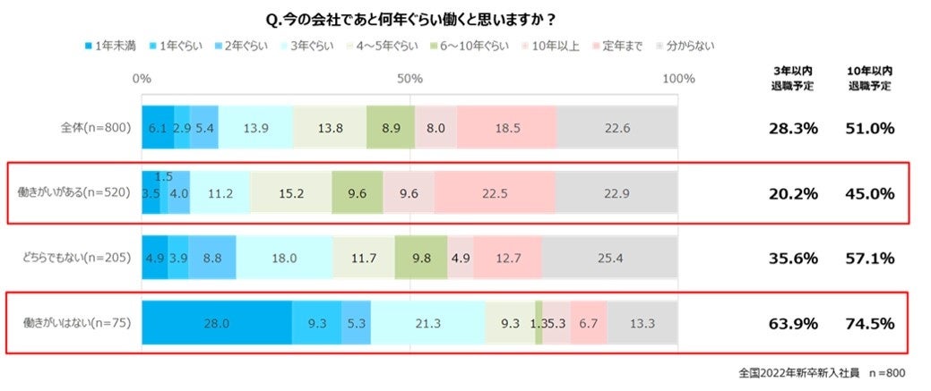 新入社員の約半数が10年以内に退職予定。「働きがいがない」新入社員の約3割は1年以内の退職を検討。今の仕事に働きがいを感じていない人は「3年以内退職予定」の回答が6 割超。