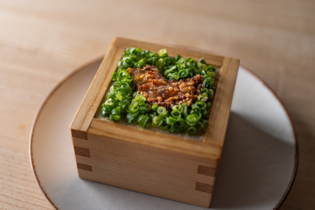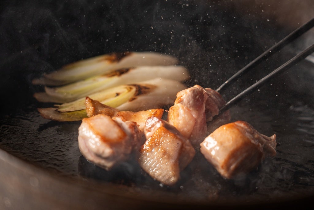 「岩手鴨」と「九条葱」に加え、ブラウンえのき、生麩といった具材を、醤油、酒、砂糖、味醂などを合わせた濃厚甘辛味の割り下でひと煮立ちさせ、生卵を絡めて召し上がっていただく一品。
