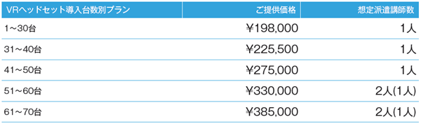 ・派遣講師数のカッコは補助講師の人数です。VR体験の運用のため、ヘッドセット台数によって補助講師が加わります。追加の補助講師は1人につき、派遣料38,500円(税込)と往復交通費がかかります。補助講師については主催者様にお手伝いいただける場合は不要になる場合があります。