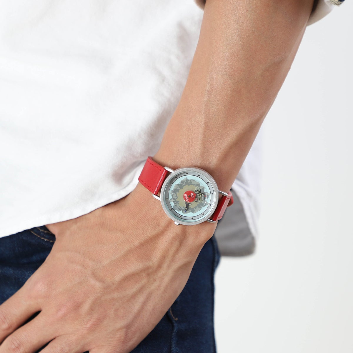 『ウルトラマンレオ』第6話「男だ!燃えろ!」の特訓シーンが腕時計になりました。分針が主人公「おおとりゲン」、時針がMACの隊長「モロボシ・ダン」が運転するジープになっており、ジープがゲンを追い立てるワンシーンが文字盤のなかに再現されています。秒針は、6話のタイトル「男だ!燃えろ!」が回転する仕様。本体裏面には二人の固い絆を感じさせる、向かい合うウルトラマンレオとウルトラセブンが描かれています。いつだって勇気を持って困難に立ち向かうウルトラマンレオの姿が、日常生活のふとした瞬間に背中を押してくれます。