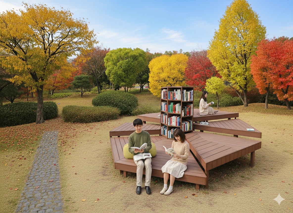 特徴1、紅葉と読書を楽しむふたつの本棚と新登場の「お昼寝ブックツリー」