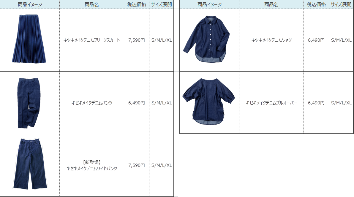 1点投入でも主役級に映えるデザイン性と、まさに“奇跡級”のスタイルアップを実現する大人のために考え抜かれたシルエットの両立が魅力です。プリーツスカート・テーパードパンツ・シャツ・プルオーバー、そして初登場のワイドパンツの、セットアップ着用も可能なデニム5アイテムをラインナップ。美しく広がる計算されたプリーツ幅で細見え・たっぷりの丈感が大人を格上げするスカート(税込¥7,590)、デニムパンツとはひと味違う「きちんと見え」を実現する、大人のためのテーパードパンツ(税込¥6,490)、ハリのあるデニムの生地感が大人らしい余裕のある立体フォルムを演出するシャツ(税込¥6,490)、ボリュームスリーブが女性らしく、着るだけで簡単に決まるプルオーバー(税込¥6,490)、センターシームが脚のラインを真っ直ぐ見せながら、体型もさりげなくカバーする新シルエットのワイドパンツ(税込み¥7,590)。サイズ展開もS~XLと豊富です。さらに、セットアップでも着用可能なデザインながらそれぞれ単品での販売なので、好みの組み合わせや、体型に合わせそれぞれ好きなサイズを選ぶことが可能です。さらに、初回販売アイテムに合わせた買い足しもお楽しみいただけます。