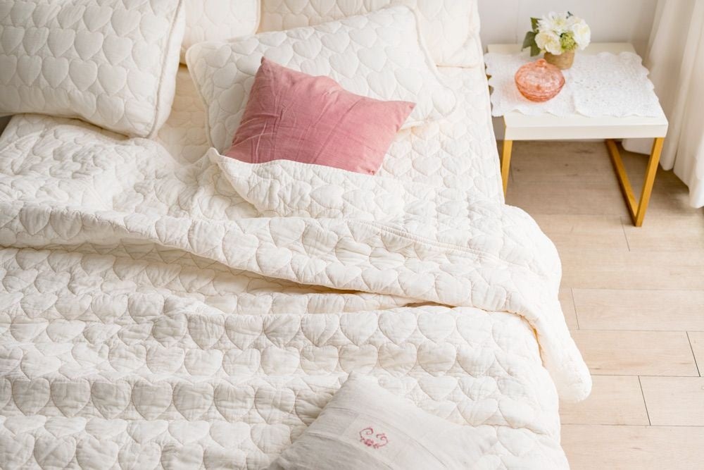「パシーマ®Xシリーズ “Beloved”ハート柄キルト」では、ピローケースとキルトケット、敷きパッドを用意。毎日の睡眠環境を快適にするための寝具一式として、トータルでカバーするラインアップを揃えました。良質な天然素材を使った寝具であることから、敏感肌の方はもちろん、赤ちゃんやお子さま、ご年配の方まで安心してご使用いただけます。