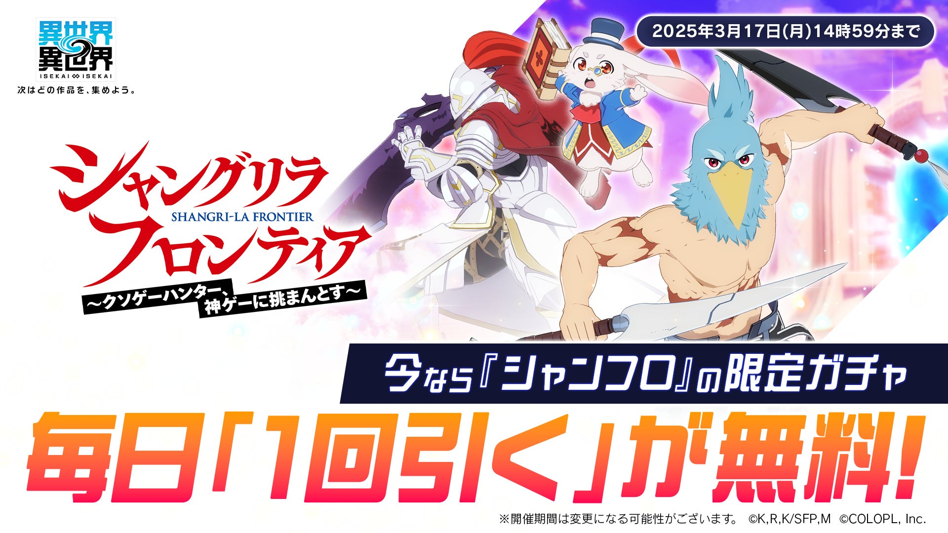 株式会社コロプラ(代表取締役社長 上席執行役員 CEO:宮本貴志、本社:東京都港区、以下「コロプラ」)は、スマートフォン&PCでもっと異世界を楽しむゲーム『異世界∞異世界』(いせかいいせかい)にて、本日2025年3月1日(土)より人気アニメ作品「シャングリラ・フロンティア」とキャラクターたちが登場していることをお知らせいたします。