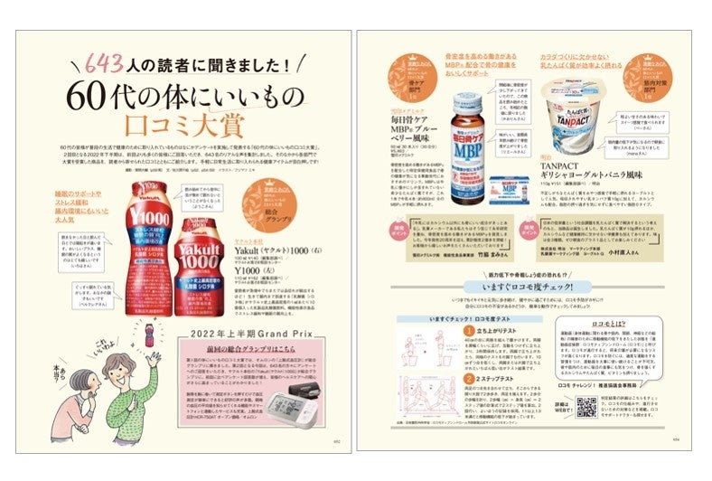 第3回となる今回は、令和の60代はアクティブな現役世代で、人生をより長く楽しむために大事な「健康寿命」を延ばしたい需要が高まっていることから、「ヘルスケア」をテーマに643名の60代女性にアンケートを実施。60代が抱える身体悩みに対応した「骨ケア」部門や「筋肉対策」部門、「血管・血圧対策」部門、「腸活」部門、「脳活」部門、「睡眠対策」部門、「乾燥対策」部門など計13部門を設定。それぞれの1位と総合グランプリを発表します。また、日本抗加齢医学会会員で美容・医療ジャーナリストの海野由利子さんと、女性ヘルスケア市場に特化したビジネスメディア「ウーマンズラボ」の編集長・星ノ矢子さんによる「60代女性が注目する健康トレンド」についての対談も収録しています。
