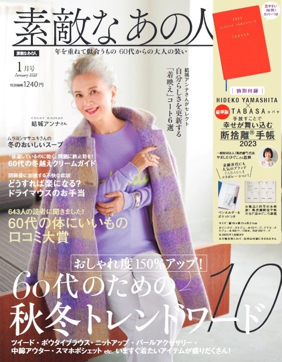ファッション雑誌販売部数トップシェア(※)の株式会社宝島社(本社:東京都千代田区、代表取締役社長:蓮見清一)が発行する『素敵なあの人』は、「60代の口コミ大賞」を11月16日(水)発売の1月号で発表します。 「60代の口コミ大賞」とは、読者がどのようなものを使っているのか、その中でもおすすめのものは何かアンケートを実施し、リアルな声を集計し、その上位アイテムを表彰するものです。口コミは、一般の人の実体験に基づいた、信憑性の高い意見であることが多いため、多くの人が参考にする情報の一つです。60代女性の多くは普段から娘やお友達など親しい間柄でいいものを教え合い、情報を得て買い物をしています。しかし近年は、対面コミュニケーションの機会が減り、SNSを多用しない60代は、情報交換できる場面が少なくなりました。そこで『素敵なあの人』 は、いいものを共有したい読者とその情報を受け取りたい読者の双方のニーズに応えたいと考え、「60代の口コミ大賞」を創設しました。