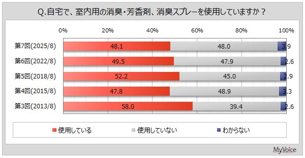 マイボイスコム株式会社(東京都千代田区、代表取締役社長:高井和久)は、7回目となる『消臭・芳香剤』に関するインターネット調査を2025年8月1日~7日に実施しました。