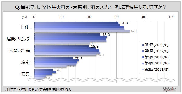 自宅で室内用の消臭・芳香剤を使用している人に、消臭・芳香剤を使用している場所を聞きました(複数回答)。「トイレ」が61.3%、「居間、リビング」が48.0%、「玄関、くつ箱」が39.9%となっています。