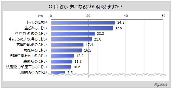 自宅で気になるにおいは(複数回答)、「トイレのにおい」「生ごみのにおい」が各3割強、「料理をした後のにおい」「キッチンの排水溝のにおい」が各2割強です。