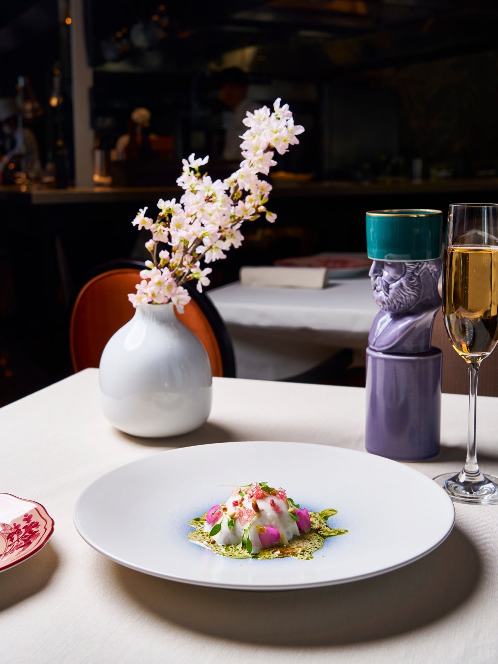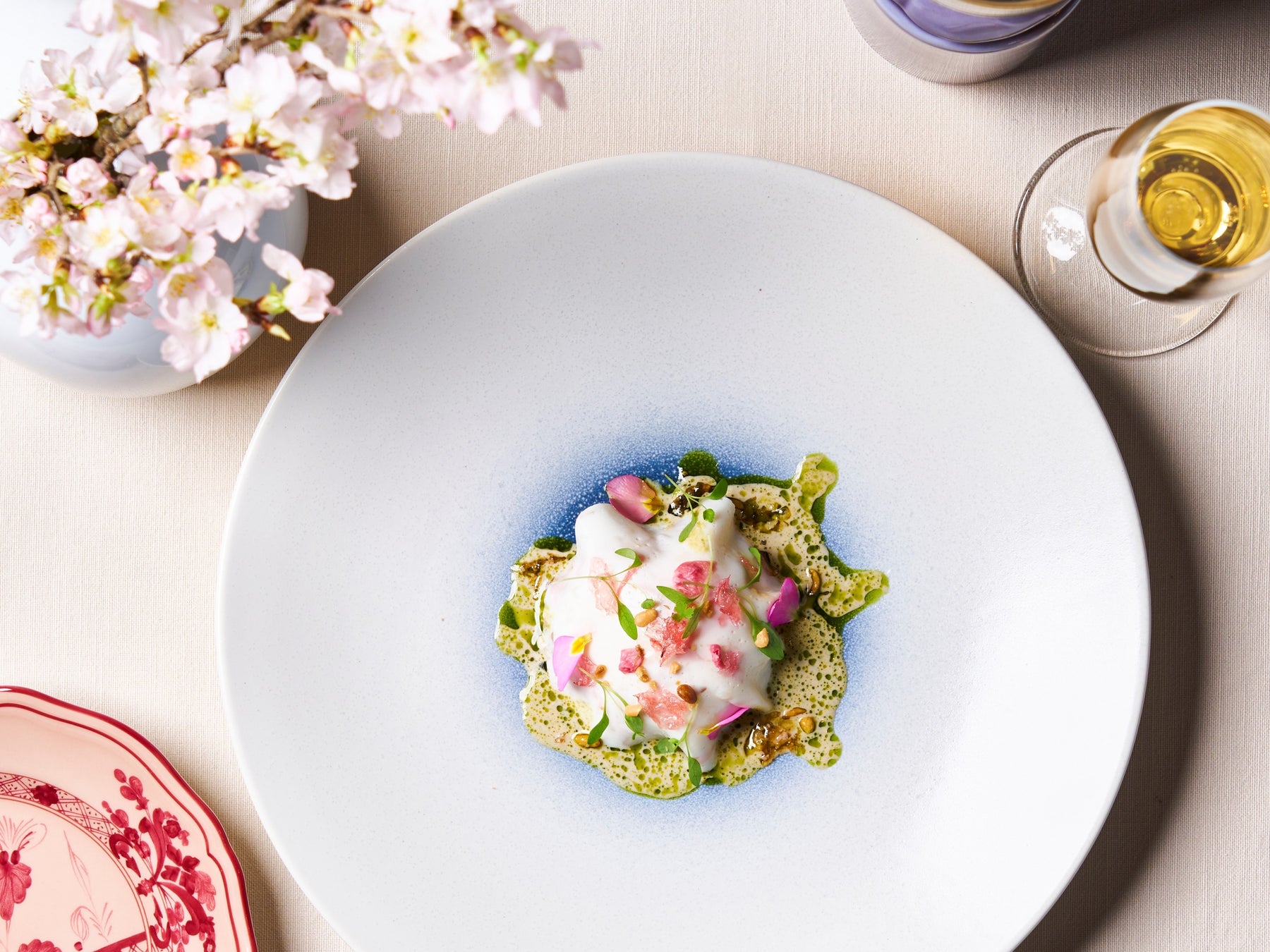 イタリア料理「ラ ベデュータ」では、桜をテーマに春を五感で味わう期間限定のディナーコースをご用意します。桜咲く季節に旬を迎えるサクラマスを軽く昆布締めし燻製する事で、その鮮やかな桜色の身から、上品な脂や濃厚な甘みと旨味を存分に引き出します。桜の花の塩漬けを使用したまろやかなミルクのシートと、桜の葉が香るオイルと松の実のソースで合わせ、桜の花びらが舞い散る雪解けの春を表現した「サクラマスのマリナート」など、季節を映す優美な春のコースをお愉しみください。