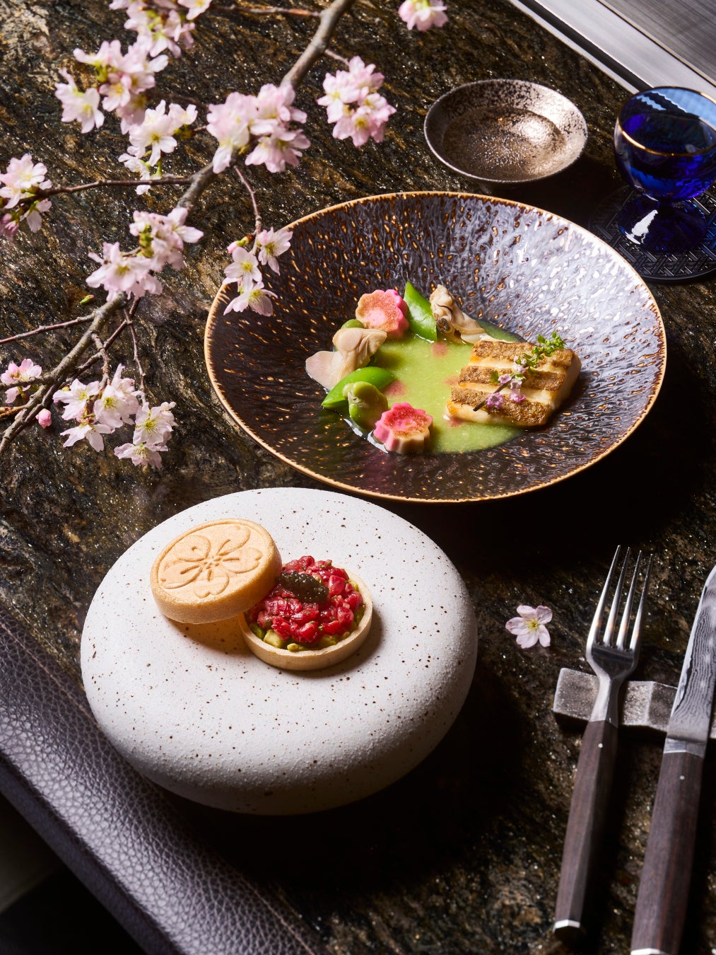 鉄板焼「和城」では、旬の食材や桜にちなんだ食材をふんだんに用いた料理を堪能する、2日間限定の「桜特別コース」をご用意。「桜肉」とも呼ばれる馬肉のタルタルに和城特製の甘だれを絡め、和城キャビアを添えて桜文様のもなかで挟んだ先付けや、春に旬を迎え、その身を美しい桜色に染める桜鯛を鉄板でふっくらと焼き、同じく春が旬のハマグリとあさりの出汁を合わせた春キャベツのすり流しの前菜など、先付からデザートまで細部にまで散りばめられた日本の春を愛しむ、雅な美食の体験へと誘います。