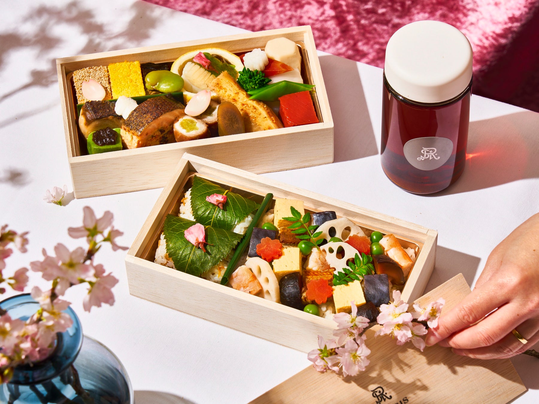 塩漬けの桜の葉で巻いたちりめん山椒ご飯、春に旬を迎える鰆、えんどう豆など季節感溢れる食材をふんだんに使用した、セント レジス ホテル 大阪の和食料理長 富崎 悦正による期間限定お花見弁当。