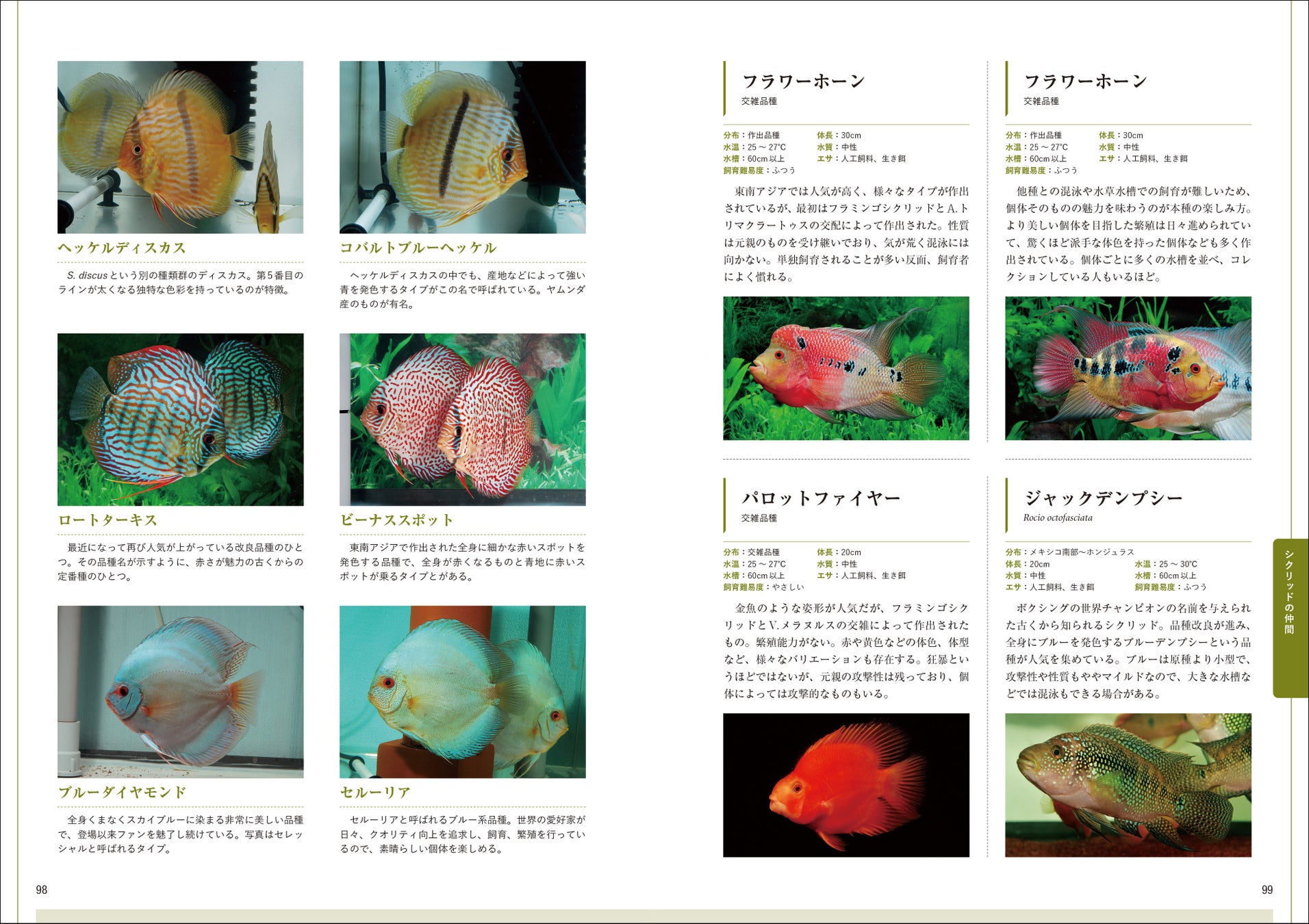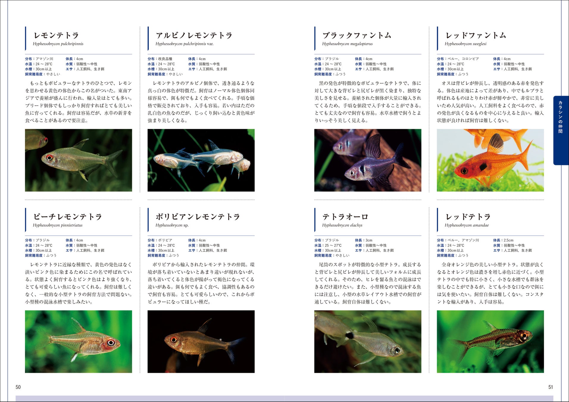 熱帯魚で人気のあるメダカの仲間から、カラシン、コイ、シクリッド、アナバス、ナマズまで定番種から注目の新種も掲載した図鑑。